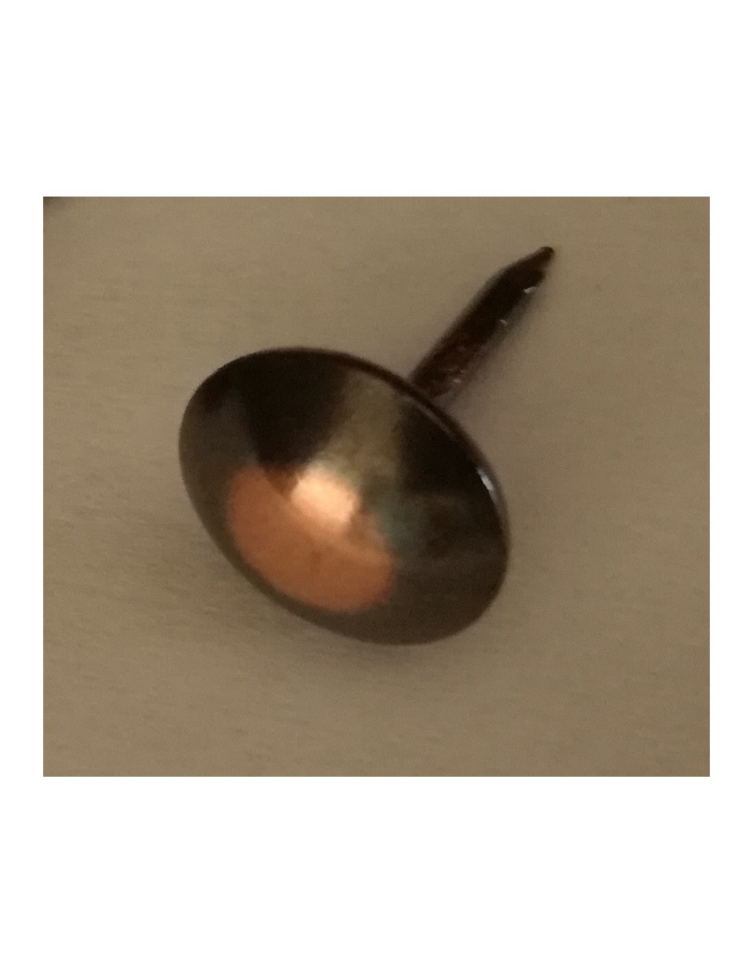 Reference 1504. Our flat head upholstery tacks are strong and corrosion resistant.  These tacks for upholstery have a shank length of 16mm, a diameter of 18mm and they’re available in different finishes such as old gold, bronze renaissance, old coppered, nickel plated, antique black oxidized, brass, pewter and old brass.