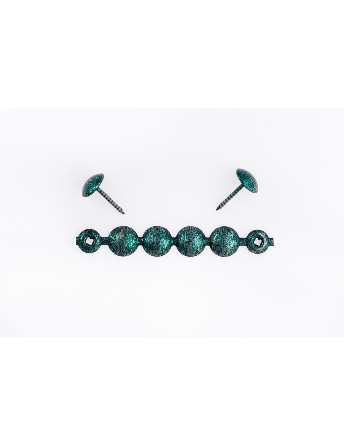 Reference 130 1/3. Nailhead trims with a diameter of 11mm. The length of the nailhead trim is 1mt. There is a hole every 4 false head. Boxes of 250mt and 6000 upholstery nails to match (to order separately - art. 1301/3). The head of these upholstery nails is embossed