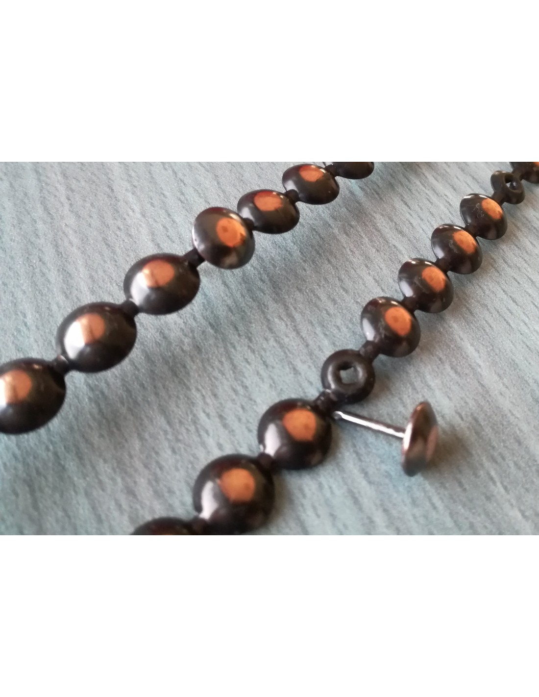 Reference 130 1/3. Nailhead trims with a diameter of 11mm. The length of the nailhead trim is 1mt. There is a hole every 4 false head. Boxes of 250mt and 6000 upholstery nails to match (to order separately - art. 1301/3). The head of these upholstery nails is embossed