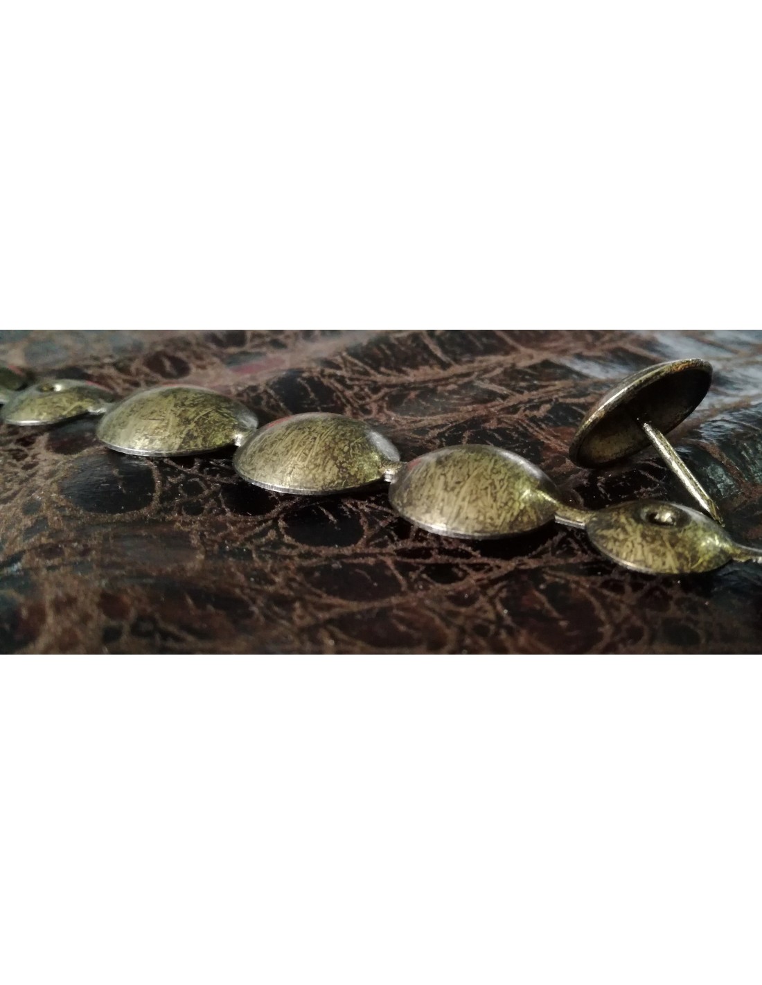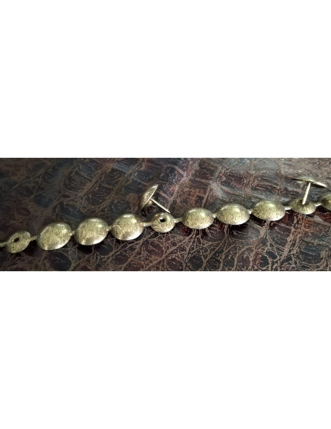 Reference 160 1/3. Upholstery nailhead trims with a diameter of 16mm. The length of the nailhead trim is 1mt. There is a hole every 3 false head. Boxes of 125mt and 2000 upholstery nails to match (to order separately - art. 1505). The available finishes are: old gold, bronze renaissance, old coppered, nickel plated, antique black oxidized, coppered, brassed, pewter, amethyst, emerald, topaz, Greek gold, pomegranate red.